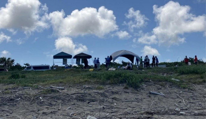 事務局からの事前説明後に活動を開始すると、時折海から腐敗臭が漂ってくるので見回すと海岸近くの波間にスナメリの死骸らしきものが見えます。毎年何度かスナメリの死骸に出くわします。ゴミを食べたとかマイクロプラスチック等が蓄積して死んだのでなければ良いのですが。