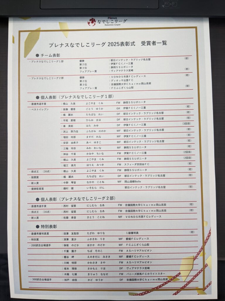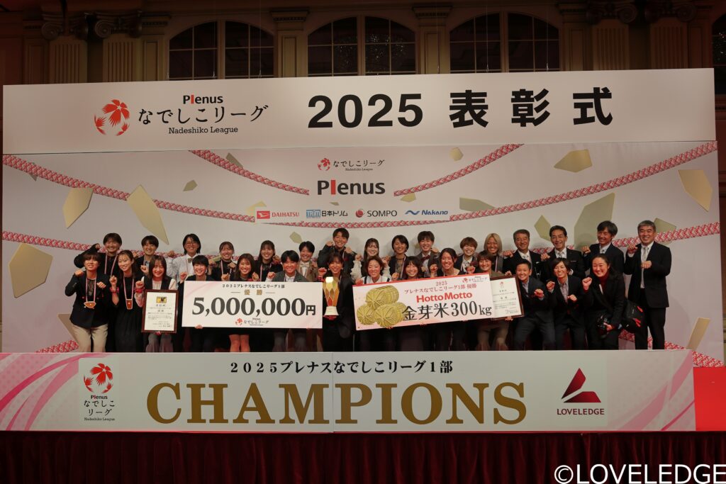 去る11月5日(水)、「なでしこリーグ2025表彰式」(於リーガロイヤルホテル東京)に出席してきました。当社が応援するリーグ1部所属の「朝日インテックラブリッジ名古屋」が今シーズン念願の初優勝を果たしたことで、栄えある表彰式に選手、チーム関係者の方々と共に我々応援企業も列席する機会を頂き、MOLグループを代表して出席してきました。