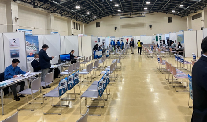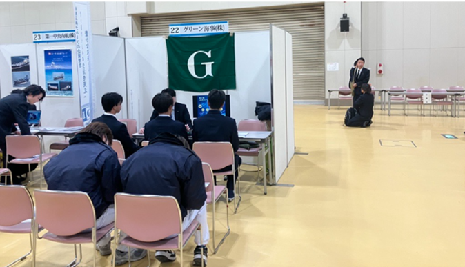 当社は昨年に続き、2回目の参加となりましたが、セミナーでは当社などの曳船会社を始め、内航船、フェリー会社などさまざまな船種を扱う企業が計43社が各々ブースを構え学生に対応しまた。